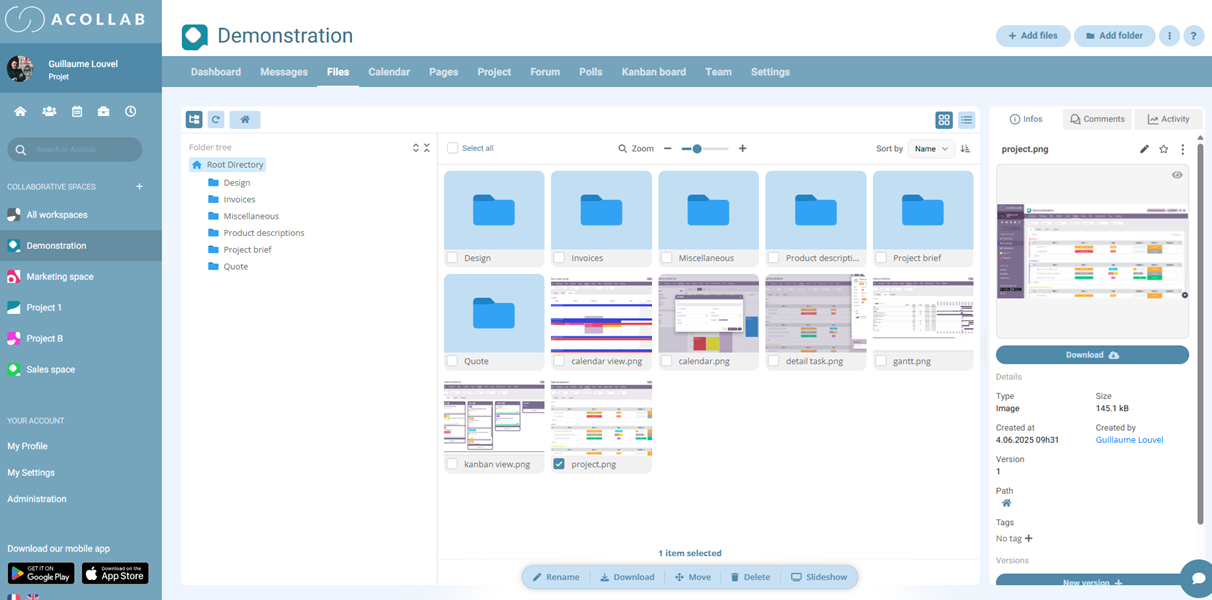 Enable widgets that you find the most useful to your workflow (your calendar, your tasks, the news feed, the latest file uploads, the latest published messages …) in order to have a quick overview of your work’s progress on the platform.